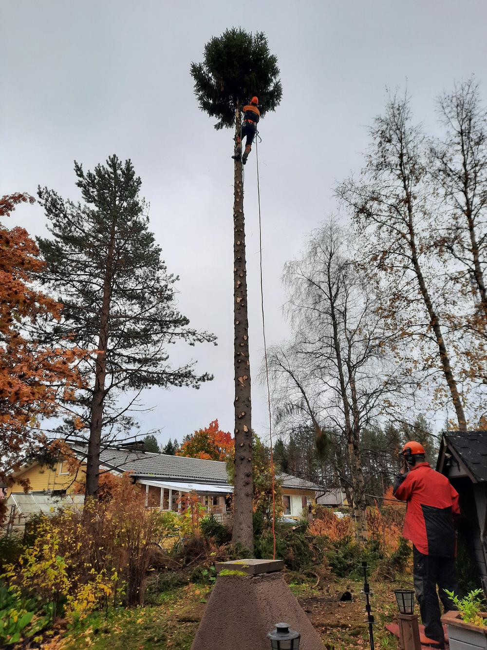 Puunkaadot/poistot ovat jokavuotista aktiviteettia. Ammattimies Veijo Nurmikumpu kiipeää ja ka rsii ja alastullessa pätkii. Me muut siivoamme eli kannamme risut ja oksat pois.