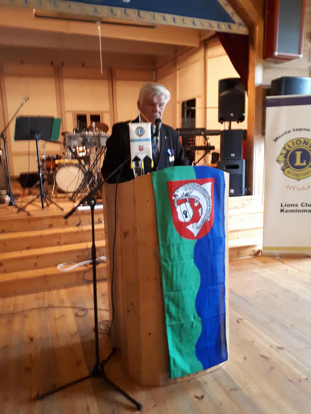 Presidentti Veikko Laakso puhuu Keminmaan Lions Klubin 60v.juhlissa.