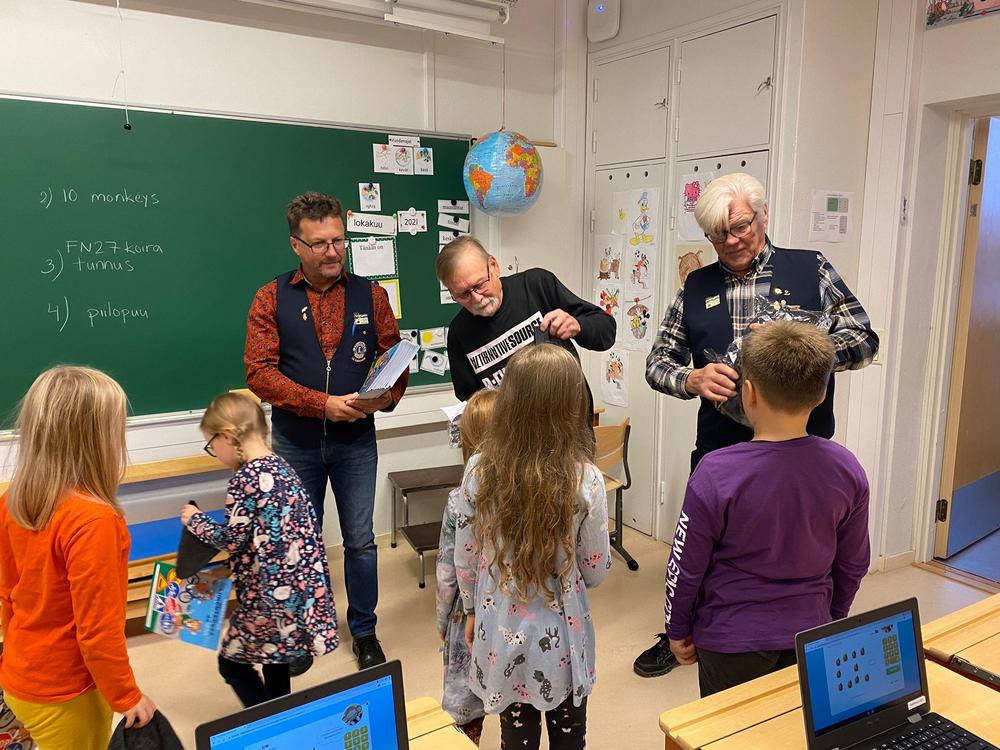 2021 lahjoitettiin Lassilan oppilaille liikennevihkoset. Jakamassa lionit Matti Alanärä, pres.Esko Linna ja Veikko Laakso.